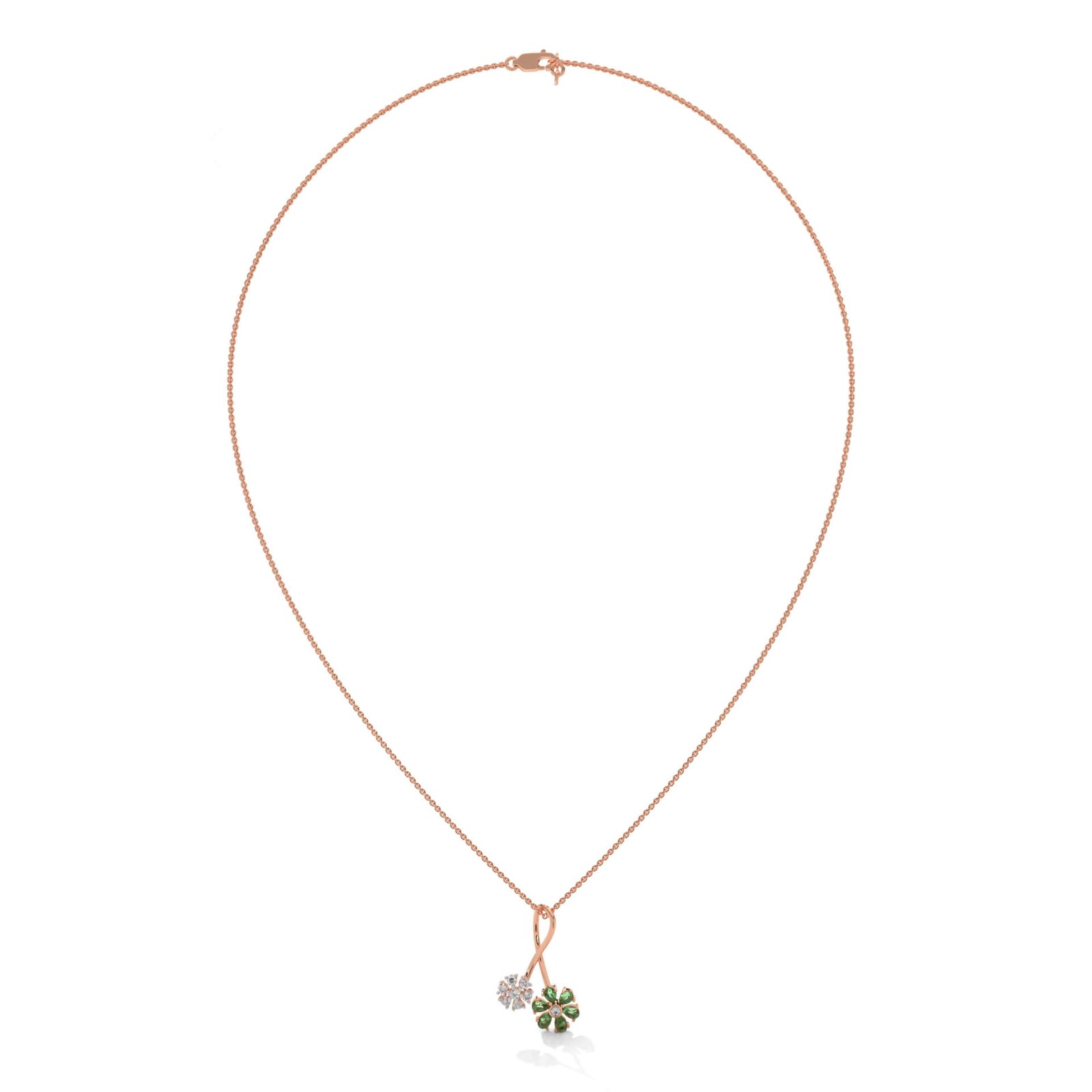 This delicate pendant celebrates nurturing beauty with two floral motifs—one adorned with green stones, the other with 8 round diamonds totaling 0.16 carats. A graceful gift for a mother’s heart.