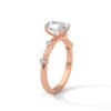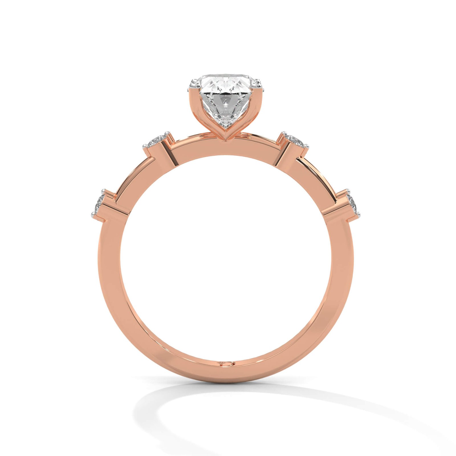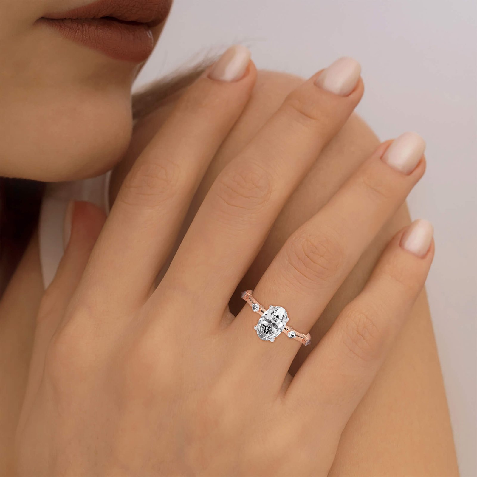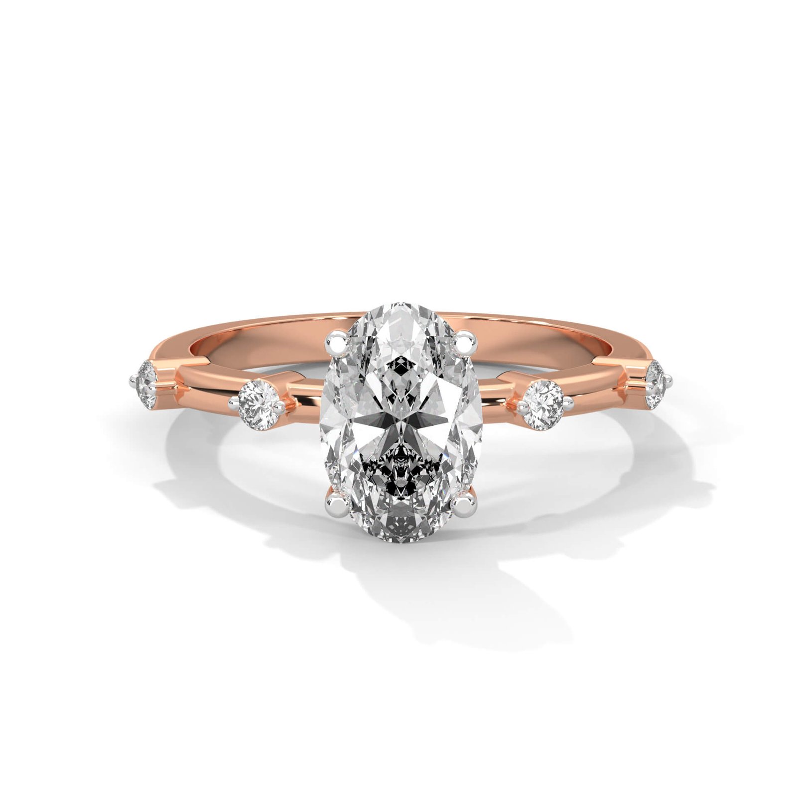 This refined design features a 1.5 ct oval solitaire embraced by a band of four round diamonds, offering a graceful play of brilliance that’s both timeless and distinctive.