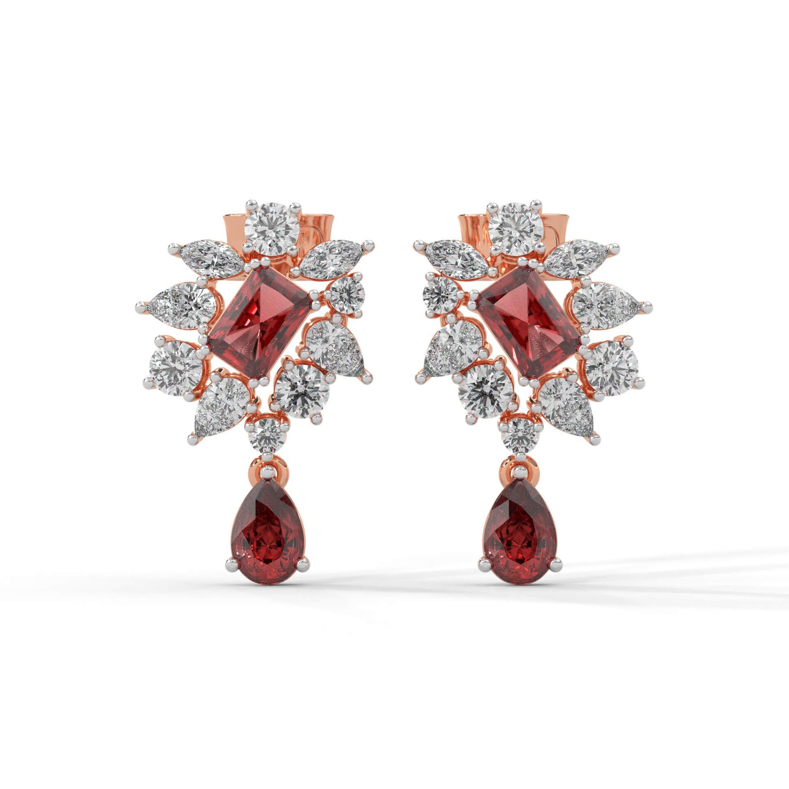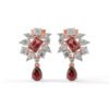 Bold and unforgettable, these fiery red-centered earrings boast 2.80 carats across 20 diamonds, blending marquise and pear cuts for high drama.