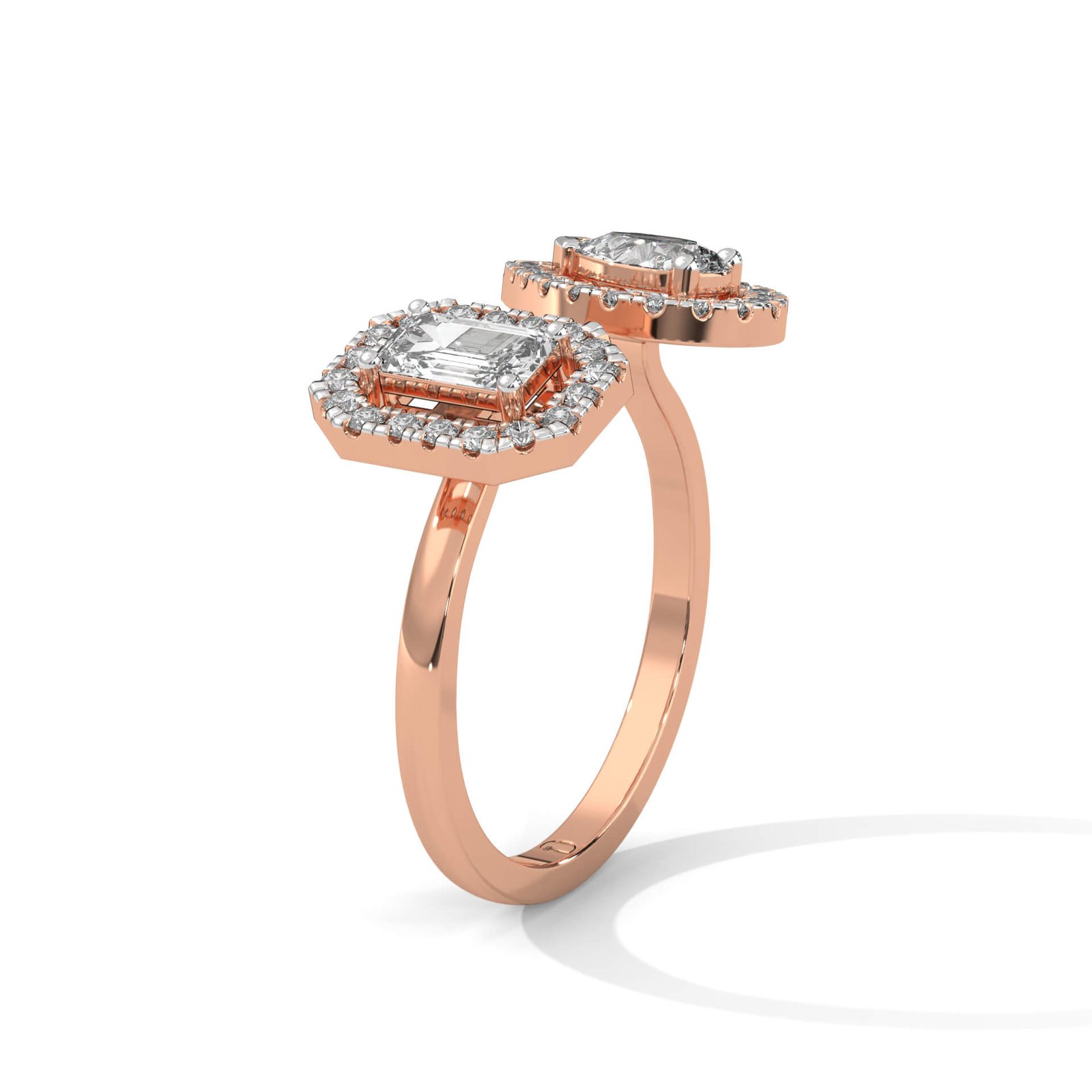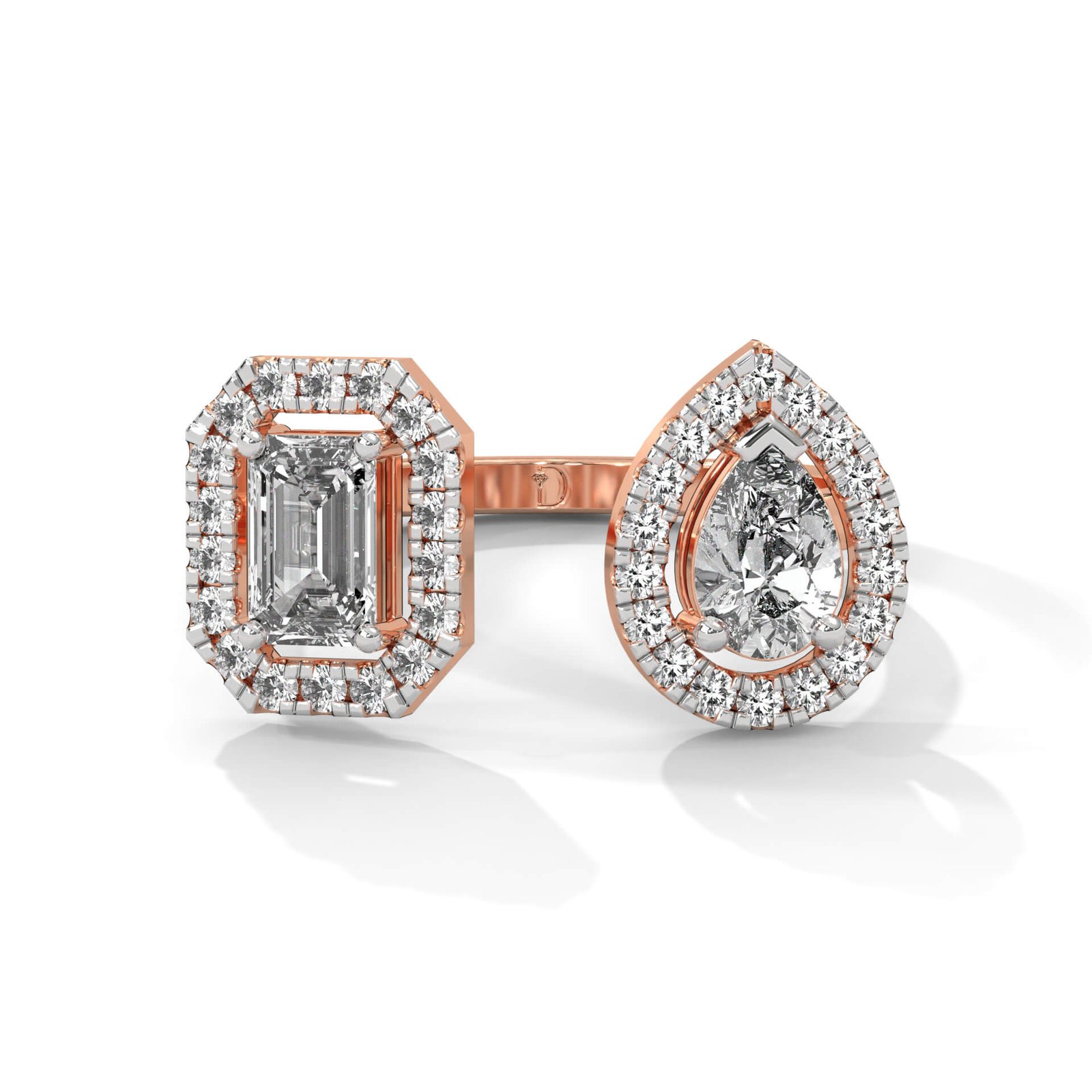 Featuring a 0.4 ct emerald-cut and a 0.4 ct pear-shaped diamond, each framed by a glittering halo of 36 round diamonds, this bypass ring is a bold statement of symmetry and sparkle.