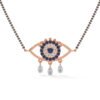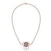 This striking evil eye design features 15 round diamonds totaling 0.29 ct, paired with sapphire accents and graceful dangling drops—a powerful symbol of protection and charm.