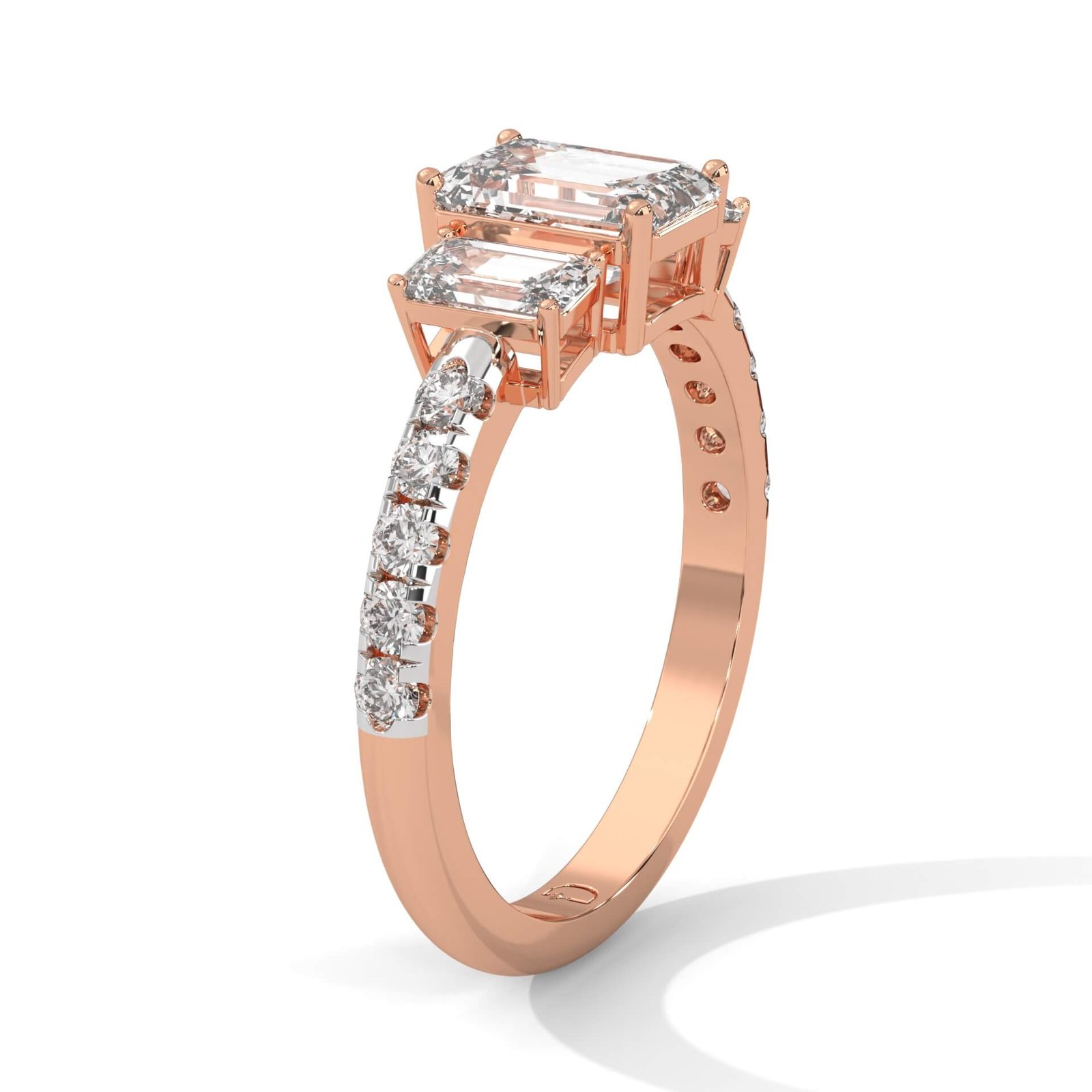 This show-stopping piece features a trio of emerald-cut diamonds totaling 1.6 ct, flanked by 10 round diamonds weighing 0.25 ct for a timeless, elegant silhouette.