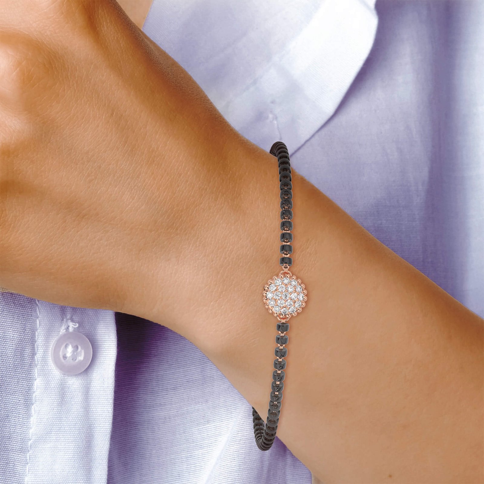 This contemporary mangalsutra bracelet radiates brilliance with 19 sparkling round diamonds. A perfect choice for those who love blending symbolism with subtle glamour.