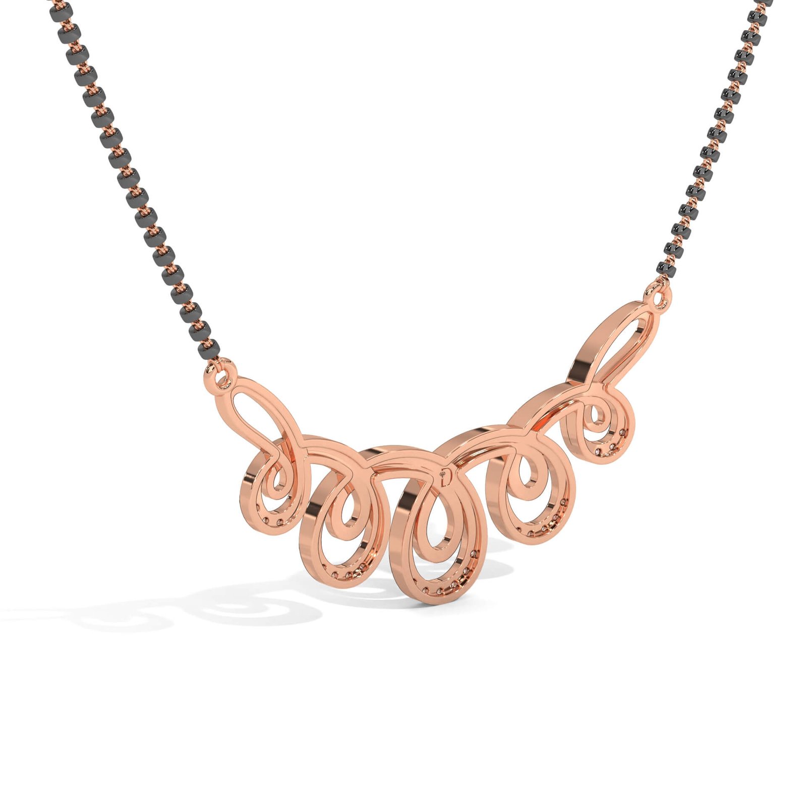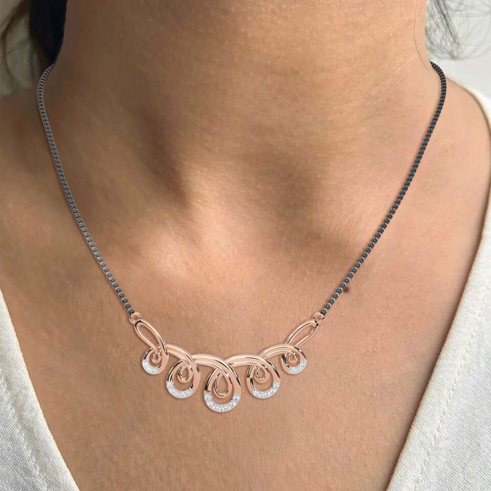 A rhythmic swirl of curves, this mangalsutra features 26 round diamonds totaling 0.16 ct. Its flowing design is a symbol of eternal love—graceful and captivating for daily wear or special moments.