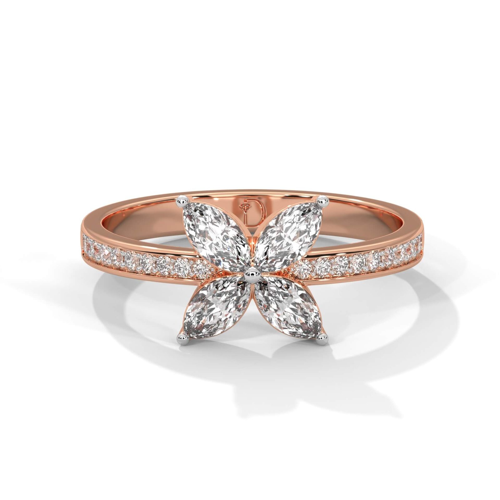 A floral-inspired beauty showcasing four marquise diamonds forming a sparkling bloom at the center, with 20 round diamonds (0.73 ct total) lining the shank for added brilliance.