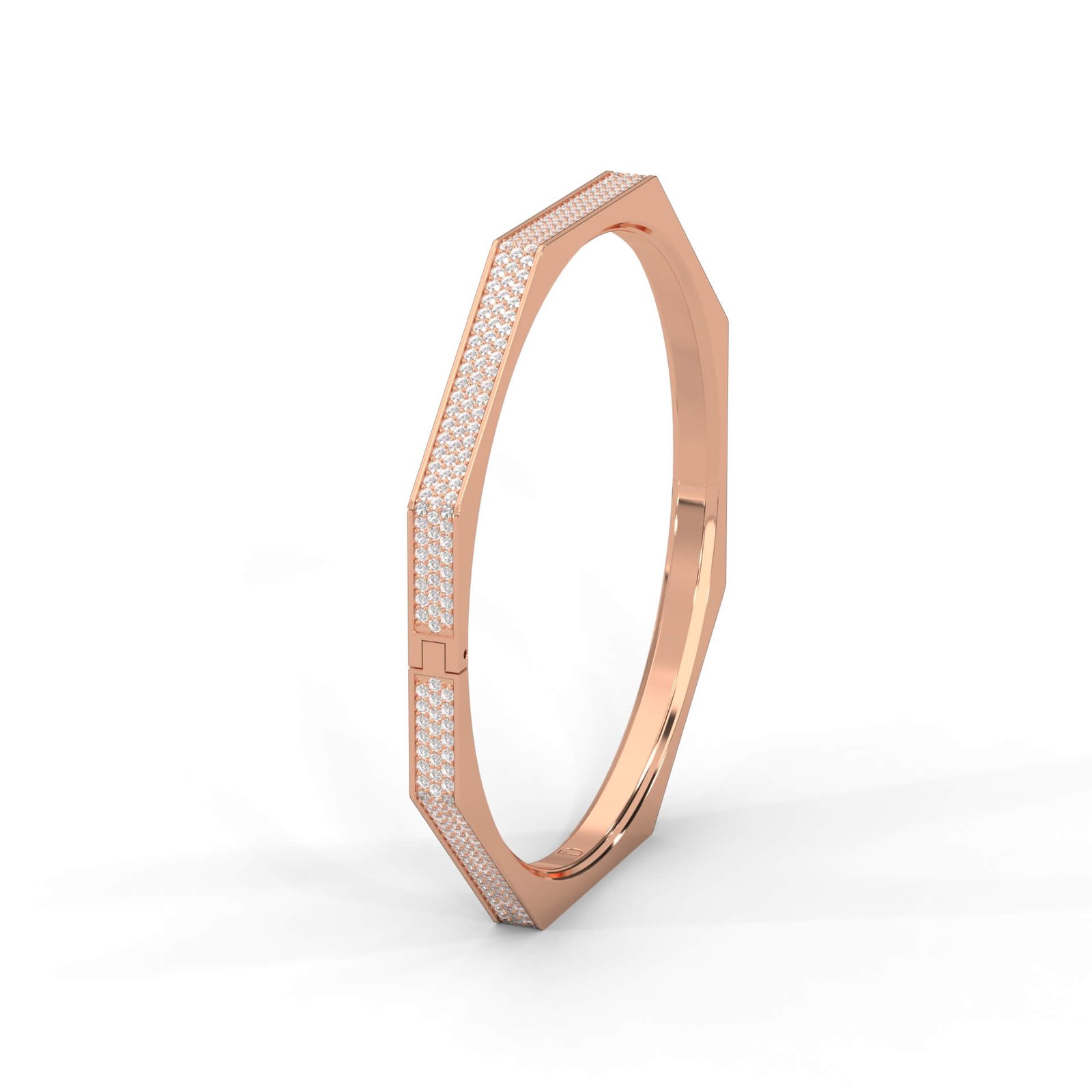 This modern geometric bangle features a flawless row of 428 round-cut diamonds (4.28 ctw) set in a sleek frame—a perfect blend of elegance and edge.
